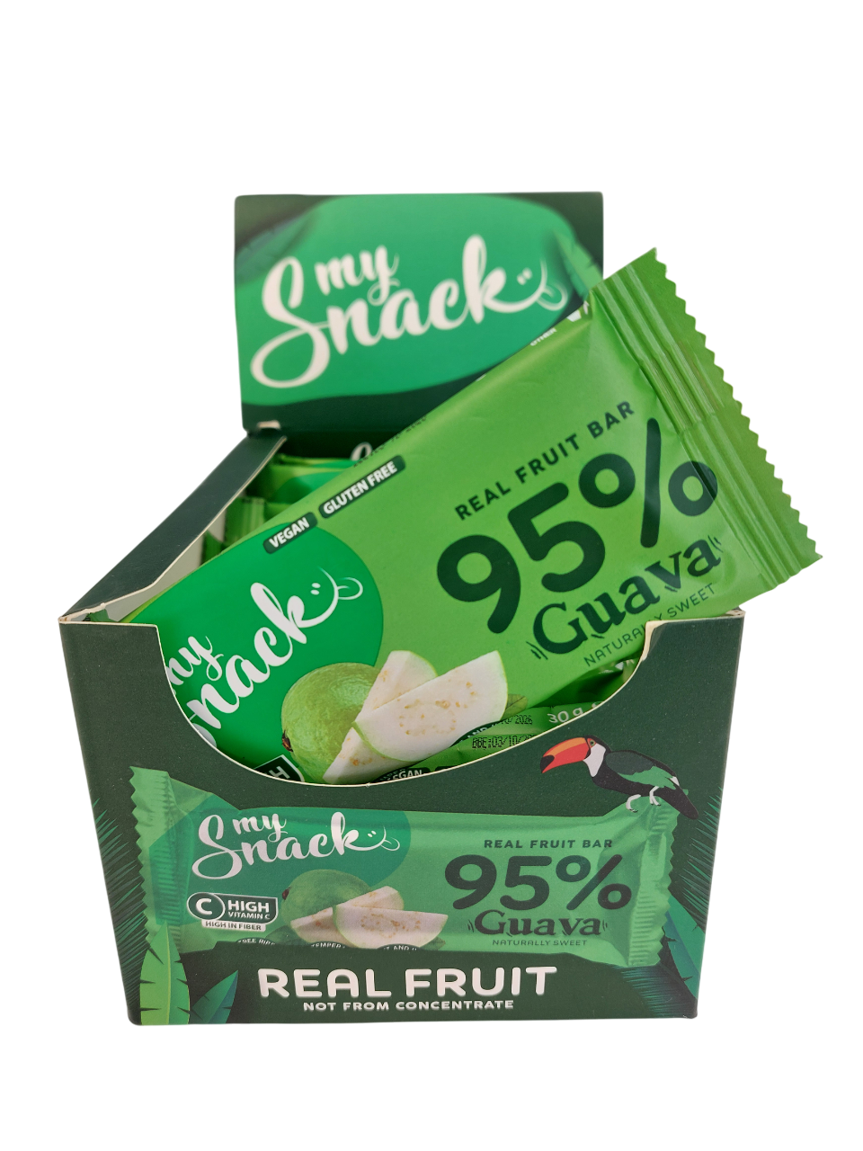 Guava hedelmäpatukat sisältävät vain kypsiä, makeita hedelmiä ja luonnollisia vitamiineja. Tämä patukka on täydellinen piristyshetki kiireisen päivän aikana – se antaa reilun annoksen C–vitamiinia, mikä tukee jaksamistasi ja energiatasojasi.